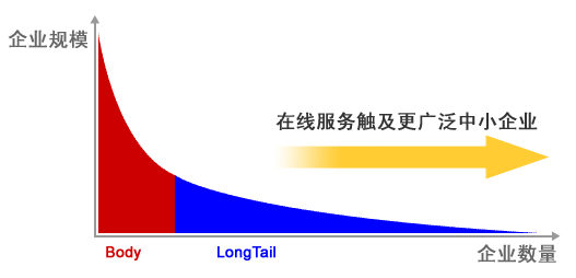 以上廠商的網(wǎng)絡(luò)廣告服務(wù)、電子商務(wù)服務(wù)都面向于中小企業(yè)市場(chǎng),而最近興起的SaaS(在線企業(yè)軟件服務(wù))也是希望通過互聯(lián)網(wǎng)服務(wù)的方式占領(lǐng)企業(yè)軟件市場(chǎng)的“長(zhǎng)尾”。