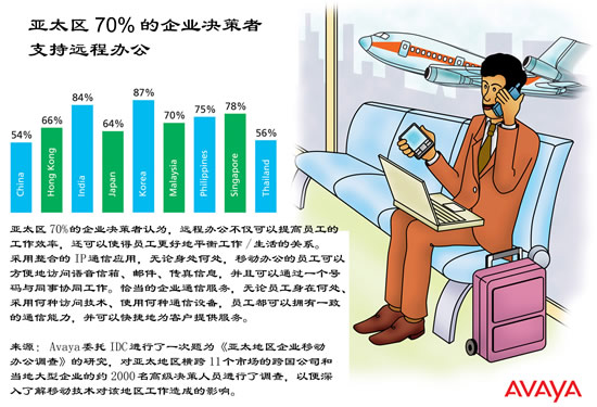 Avaya委托IDC進行了一次題為《亞太地區(qū)企業(yè)移動辦公調(diào)查》的研究,對亞太地區(qū)11個主要市場的跨國公司和當?shù)卮笮推髽I(yè)的約2000名高級決策人員進行了調(diào)查,以便深入了解移辦公技術對該地區(qū)工作造成的影響。