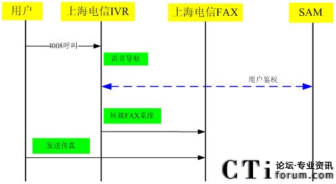 用戶撥打4008號碼,呼叫統(tǒng)一落地到上海電信IVR平臺,完成自動語音、用戶鑒權(quán),然后通過后向線路將呼叫上海電信Fax系統(tǒng),完成傳真接收服務(wù)