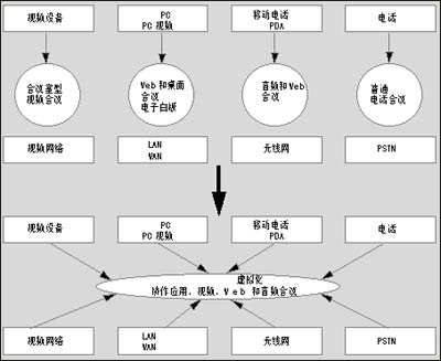 典型的大企業(yè),其電話會議,視頻會議以及網(wǎng)絡(luò)與數(shù)據(jù)會議通常是相互獨(dú)立的系統(tǒng)。UCC可以實(shí)現(xiàn)各種通信平臺的協(xié)同工作,員工只需使用一個通用界面便可調(diào)用多種終端設(shè)備。它將視頻會議、音頻會議、短消息以及網(wǎng)絡(luò)接入結(jié)合在一起。還能結(jié)合IP電話功能,如狀態(tài)信息功能等。本專題專門介紹了業(yè)界較為成功的幾種融合視頻概念和產(chǎn)品。